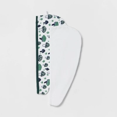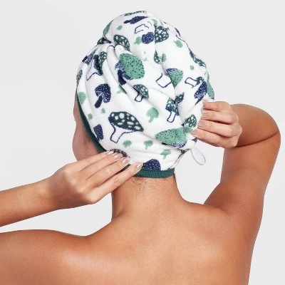 Help keep your hair dry with this 2-Pack of Mushroom-Print Hair Wraps from Room Essentialsā¢. Made from a soft, year-round fabric, these printed hair wraps feel soft against your head and help keep your hair in place while drying. Plus, they’re designed with a small elastic loop at the back for conveniently wrapping your hair. This pack includes two hair wraps ā one in solid white and one with allover mushroom prints in green on a white background ā to add sweet style to your bathing and grooming routine.