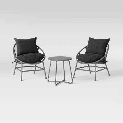 Create a comfortable and stylish space for working, studying or just hanging out with the 3-Piece Metal Mesh Small Space Set from Room Essentials™. This three piece set includes two metal mesh chairs and a small table. They feature a sleek black metal frame that offers a cool minimalist look and matches well with just about any decor aesthetic so you can personalize your space to match your unique style! Comfy cushions also add a sense of coziness to your space so you can relax and recharge or get some work done. Fade-resistant material also make for easy maintenance and keeps the pieces looking their best.