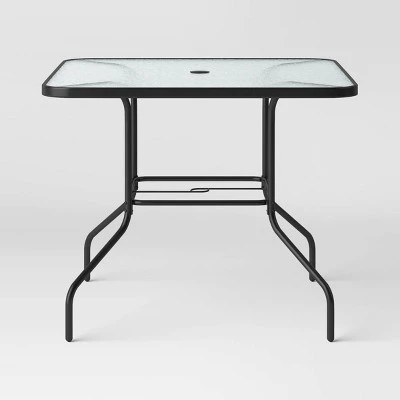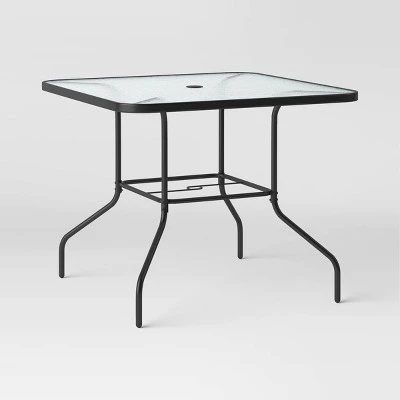 The 6-Piece Dining Set with Umbrella from Room Essentials™ makes the perfect addition to your backyard, deck, garden or sunroom. This multi-piece patio dining set is water- and rust-resistant for continued and comfortable outdoor use. The square table features a glass tabletop, an umbrella to shade you on those hot, sunny days, and sports a black-finish steel frame for a sleek look that goes well with any decor style. With the included armchair seating for four, this outdoor set is perfect for enjoying a cozy family dinner in the sunshine or chatting with friends over tea, coffee and beyond.
