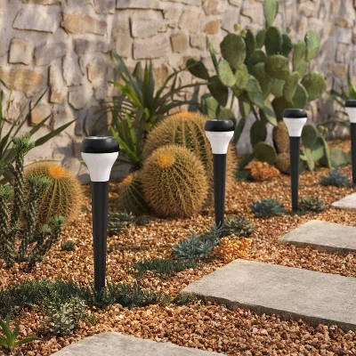 Garner compliments for your beautiful pathway with the 6-Pack Round Solar LED Outdoor Path Lights from Room Essentialsā¢. Designed in a microphone-like shape, this pack of six matte-black path lights light up automatically for a glowing space. They can be hung or staked according to your needs, and are solar powered to help you save energy. Designed with integrated LED bulbs, these round path lights require six AA nickel metal hydride batteries.