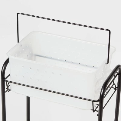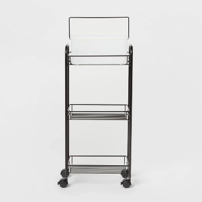Keep your bath essentials organized in simple style by using the Bathroom Storage Cart from Room Essentialsā¢. Designed with a mix of metal and plastic, this black storage cart features wired shelves to nicely hold bath towels, storage boxes and other items. This sleek storage cart comes with castor wheels for easy movement anywhere around your home.