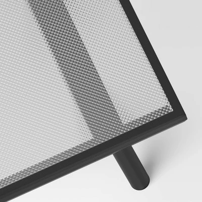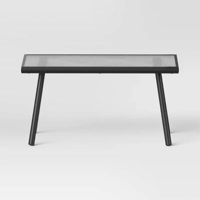 Create a stylish entertainment area in your outdoor space with this Glass Rectangle Patio Coffee Table from Room Essentialsā¢. This metal coffee table in a weather-resistant finish makes a great addition to any outdoor space. The glass rectangular tabletop provides plenty of space for snacks and beverages, and it sits atop four slatted legs for a simple yet stylish design. Place in front of a patio bench or a set of wicker chairs for an elegant space on your deck or patio.