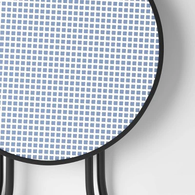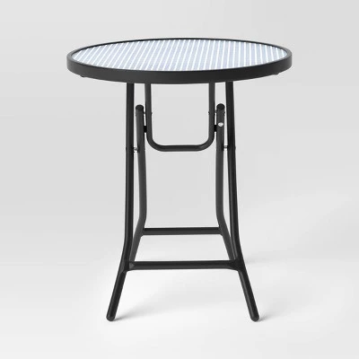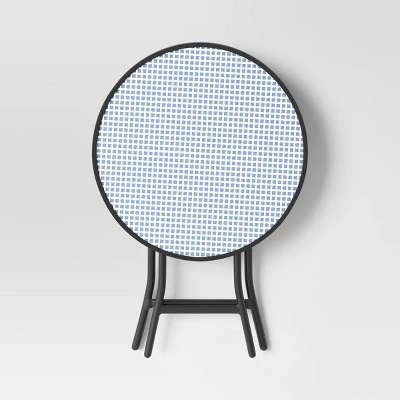 Add a beautiful accent piece to your outdoor decor with the Glass Round Printed Folding Outdoor Portable Side Table from Room Essentialsā¢. This blue side table features a printed pattern on the tabletop for an attractive look. Standing on an X-shaped base, its weather-resistant metal frame promotes lasting outdoor use, and the foldable design makes it easy to fold and store.