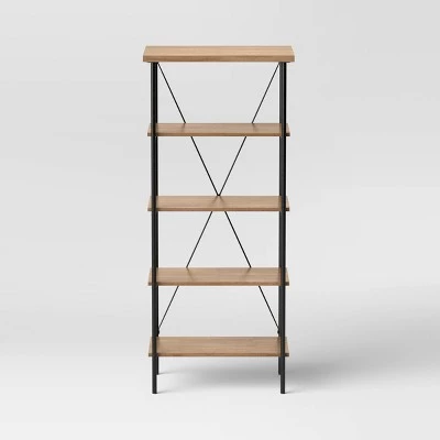 Showcase your book collection in style with this Mixed-Material Media Tower Bookcase from Room Essentialsā¢. Supported on a metal frame with an X shape at the back, this bookcase features five open natural-hue wood shelves to display a variety of items. Whether you use it to organize books, display showpieces, artwork, speakers or framed photos, this media tower bookcase will bring sleek style to your space.