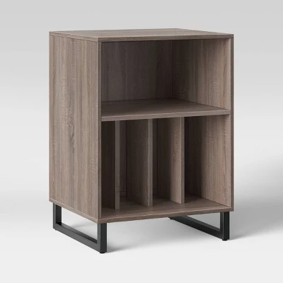 Update your TV room or entertainment area in chic, contemporary style with the Mixed Material Record Listening Station from Room Essentialsā¢. Featuring a sleek build with a laminated design and a geometric base for a contemporary look, this gray record listening station is perfectly sized to securely place your record player inside while the record dividers below offer plenty of space to keep your albums or DVDs organized. Crafted from a solid wooden frame, this wooden media storage cabinet can also be used as a bookshelf or simply to organize your audio equipment and DVDs. Two people recommended for assembly. Assembly time is approximately 1-2 hours.