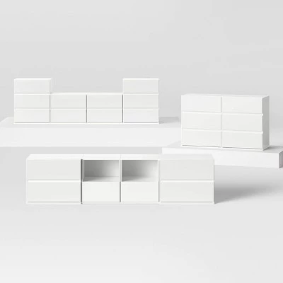 Add a minimalist look and clean lines to your space with this Modular Furniture Collection from Room Essentials™. This modern furniture collection features modular pieces with drawers that can be used separately or stacked together for numerous storage options. The solid white finish complements a range of home decor palettes, while the smooth top surface offers a space for your reading lamp, alarm clock or a glass of water. Plus, the collection is perfect for smaller spaces like dorm rooms.