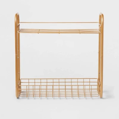 Create an elegant look in your bath space while adding space-saving storage with the On The Wall 2-Tier Shelving Rack from Room Essentialsā¢. Made with metal, this metallic gold shelving rack makes a stunning addition to your bath space. This metal shelving rack comes with two open shelves to help provide ample space for your shampoo, towels and more, while providing easy access to them.