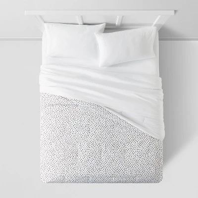 Snooze away the night in luxury and comfort with the Reversible Microfiber Dot Comforter from Room Essentials™. Boasting a microfiber construction that feels soft against your skin, this decorative comforter is generously filled to ensure you stay cozy and comfy as you hit the lights and delve into the world of your magical dreams. Featuring a subtle tufted design and decked out with allover black dots on a white background that match the white reverse, giving you more options to dress up your bed, this dotted microfiber comforter is easy to match with a variety of bedding pieces to highlight your artistic taste. Simply coordinate it with a solid white sheet and pillows to fill your bedroom with a chic artisan vibe, or add bright shams and pillows in colorful hues and printed percale sheets to show off your imagination.