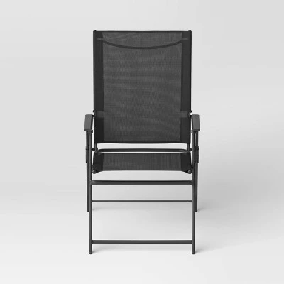 Update your home decor with the Sling Folding Chair from Room Essentialsā¢. This black chair features a mesh design with a metal frame for a sleek look you’ll love accenting your home with. With a cool weather-resistant design, this sling chair comes with armrests for comfortable sitting, and can be folded for convenient storage.