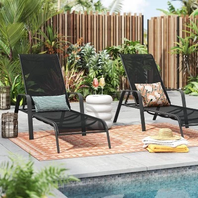 Relax on a summer’s afternoon in your backyard with this Sling Stacking Steel Outdoor Patio Chaise Lounge from Room Essentials™. Made from weather- and rust-resistant steel to help keep it protected from the elements, this chaise lounge features a seat and back that let you soak up some sun in comfort. Plus, the foldable design provides you with extra storage or display space. In a solid black hue, this stacking chaise lounge blends seamlessly into your space.
