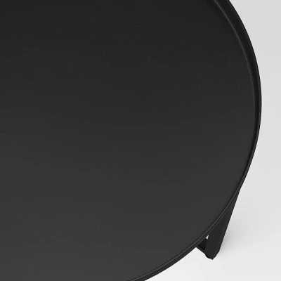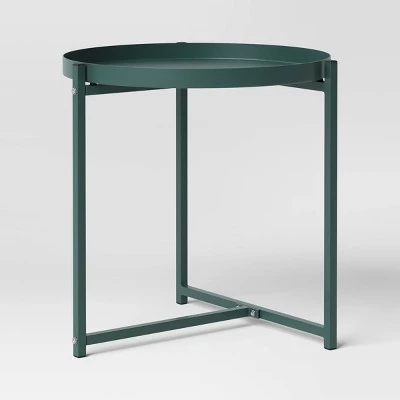 Upgrade your outdoor living with this Tray Top Metal Accent Table from Room Essentials™. Ideal for resting your favorite drink, book or potted succulent, this patio accent table features a rounded structure with a tray top design that is fixed in place on a sleek and solid metal base. The all-weather finish allows for use season after season, and the solid color frame coordinates with any decor. Place it next to your outdoor sofa, chaise lounger or in between your favorite outdoor chairs.