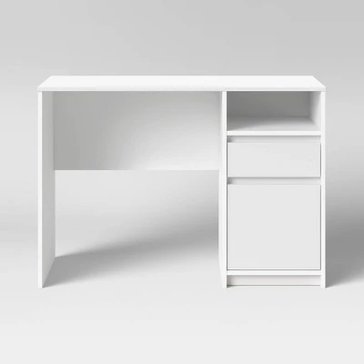 Add a touch of elegance to your workspace with this Writing Desk with Drawers from Room Essentials™. Showcasing a wooden construction, this rectangle writing desk comes complete with a built-in drawer and an open shelf to offer plenty of room for storing your files and other workspace essentials. The tabletop features ample room for writing or working on a laptop, along with space for placing a lamp, pen holder and other must-have desk accessories. Designed in a solid color for versatile styling, this wooden writing desk blends seamlessly with your existing decor style.